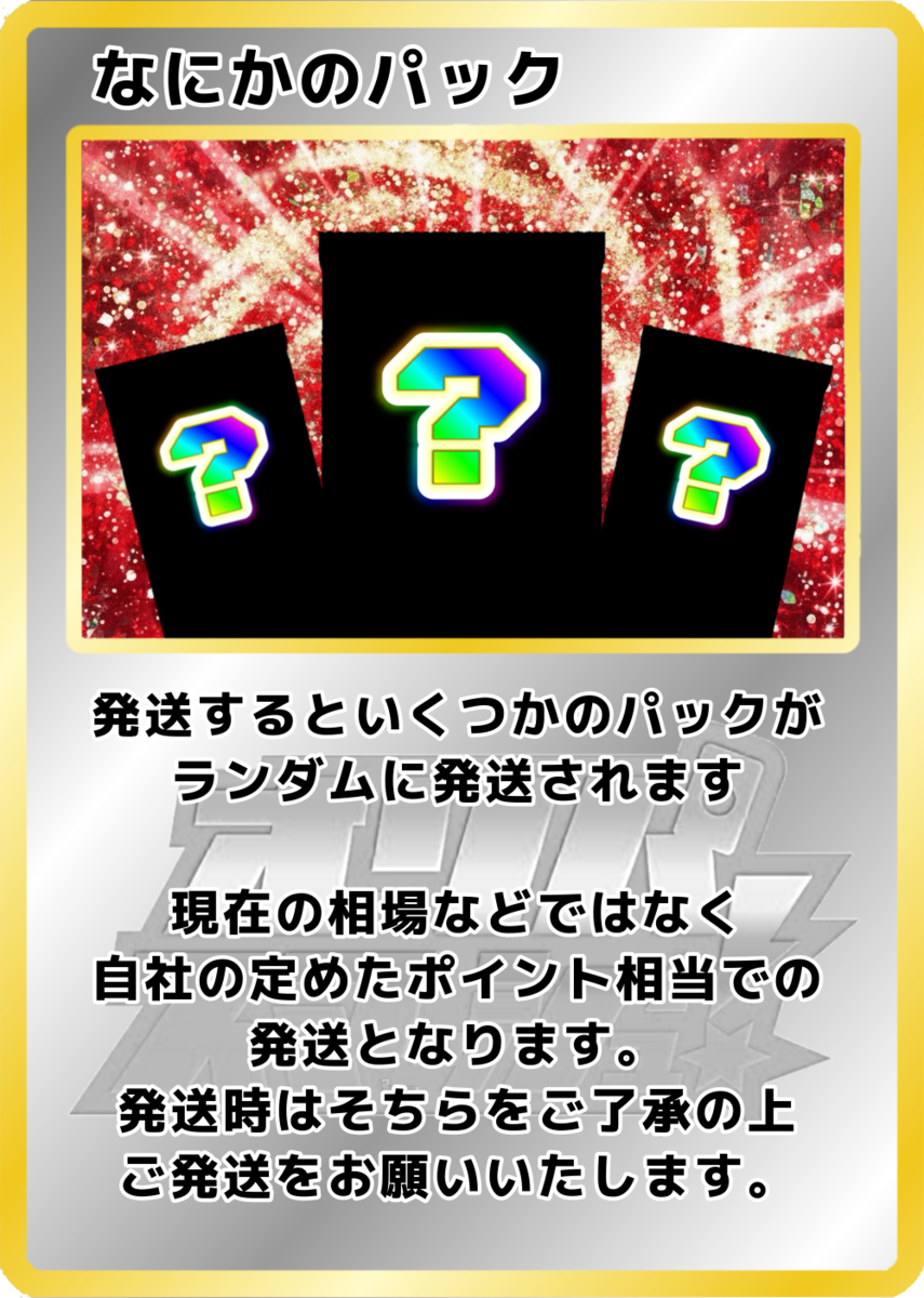 【カードやケースの状態について】 オリパから排出されるカードや鑑定済みカード(ケース入り)には、微細な傷や初期キズが見られる場合がございます。 特に鑑定済みカード(PSA等)は、鑑定機関が付与したグレードに基づいて販売しております。そのため、ケース内部で確認できる擦れや異物については、返品・交換を承ることができませんのでご了承ください。 また、ガチャから排出されるカードは一部鑑定済みカードではございませんので、個体差があります。予めご確認の上ご購入くださいませ。 【未開封商品の取り扱い】 未開封BOXやパックであっても、外装にスレや凹み、シュリンクの破れやテープ跡などがある場合がございます。また、流通過程上「再シュリンクの可能性を完全に否定すること」はできません。 安心してご利用いただくため、商品到着から開封までを通して動画撮影を推奨しております。動画内で偽造品と確認できた場合に限り、返品・交換を受け付けます。撮影の際は梱包物全体が画面に収まるようご注意ください。 【商品画像について】 掲載している画像はあくまでイメージであり、実際にお届けするカードやアイテムの状態・排出内容を保証するものではございません。表示以外のカードやアイテムが排出される可能性もあります。 【還元率とコインについて】 還元率は「対象のオリパをすべて購入した場合の理論値」に基づいています。 ただし、抽選によって得られるカードのコイン換算額は完全ランダムであり、すべての口数で同一の金額が保証されるものではございません。 【返品・交換について】 システムの性質上、原則として商品の返品・交換・返金はできません。 【演出表示について】 抽選時の演出動画はお楽しみ要素であり、当選内容やランクを保証するものではありません。通信環境や端末の仕様により、演出が正しく表示されない場合がありますが、その際も抽選結果や景品には影響ございません。再抽選・返金などの対応はいたしかねます。 【エディションに関する注意】 1st Edition(1ED)とアンリミテッド版が存在する商品については、商品タイトルにエディションの記載がない場合、どちらかを選択することはできません。 商品画像に1EDの表記があった場合でも、タイトルに記載がなければ対象外となりますので、あらかじめご了承ください。
