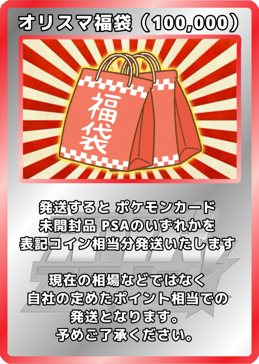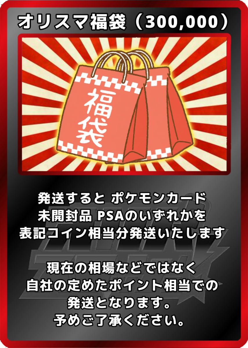 【カードやケースの状態について】 オリパから排出されるカードや鑑定済みカード(ケース入り)には、微細な傷や初期キズが見られる場合がございます。 特に鑑定済みカード(PSA等)は、鑑定機関が付与したグレードに基づいて販売しております。そのため、ケース内部で確認できる擦れや異物については、返品・交換を承ることができませんのでご了承ください。 また、ガチャから排出されるカードは一部鑑定済みカードではございませんので、個体差があります。予めご確認の上ご購入くださいませ。 【未開封商品の取り扱い】 未開封BOXやパックであっても、外装にスレや凹み、シュリンクの破れやテープ跡などがある場合がございます。また、流通過程上「再シュリンクの可能性を完全に否定すること」はできません。 安心してご利用いただくため、商品到着から開封までを通して動画撮影を推奨しております。動画内で偽造品と確認できた場合に限り、返品・交換を受け付けます。撮影の際は梱包物全体が画面に収まるようご注意ください。 【商品画像について】 掲載している画像はあくまでイメージであり、実際にお届けするカードやアイテムの状態・排出内容を保証するものではございません。表示以外のカードやアイテムが排出される可能性もあります。 【還元率とコインについて】 還元率は「対象のオリパをすべて購入した場合の理論値」に基づいています。 ただし、抽選によって得られるカードのコイン換算額は完全ランダムであり、すべての口数で同一の金額が保証されるものではございません。 【返品・交換について】 システムの性質上、原則として商品の返品・交換・返金はできません。 【演出表示について】 抽選時の演出動画はお楽しみ要素であり、当選内容やランクを保証するものではありません。通信環境や端末の仕様により、演出が正しく表示されない場合がありますが、その際も抽選結果や景品には影響ございません。再抽選・返金などの対応はいたしかねます。 【エディションに関する注意】 1st Edition(1ED)とアンリミテッド版が存在する商品については、商品タイトルにエディションの記載がない場合、どちらかを選択することはできません。 商品画像に1EDの表記があった場合でも、タイトルに記載がなければ対象外となりますので、あらかじめご了承ください。