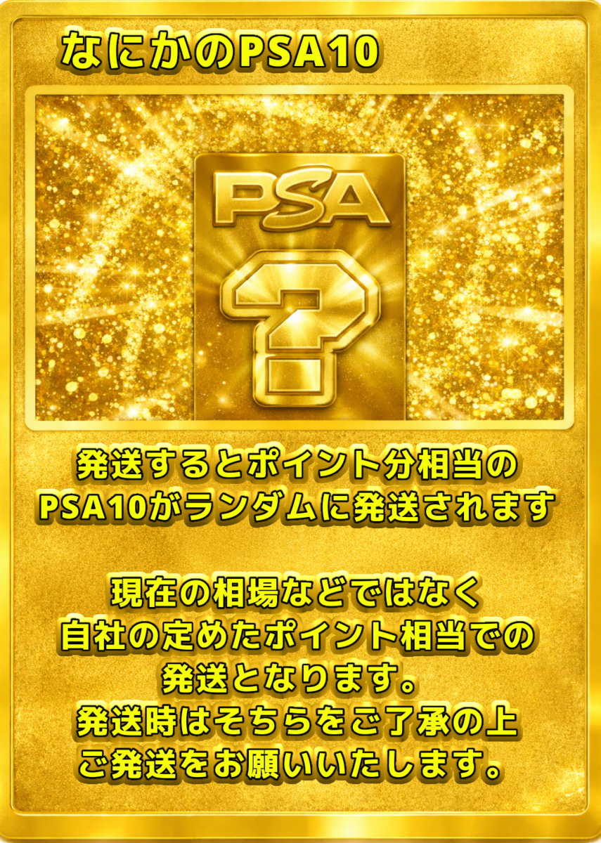 【カードやケースの状態について】 オリパから排出されるカードや鑑定済みカード(ケース入り)には、微細な傷や初期キズが見られる場合がございます。 特に鑑定済みカード(PSA等)は、鑑定機関が付与したグレードに基づいて販売しております。そのため、ケース内部で確認できる擦れや異物については、返品・交換を承ることができませんのでご了承ください。 また、ガチャから排出されるカードは一部鑑定済みカードではございませんので、個体差があります。予めご確認の上ご購入くださいませ。 【未開封商品の取り扱い】 未開封BOXやパックであっても、外装にスレや凹み、シュリンクの破れやテープ跡などがある場合がございます。また、流通過程上「再シュリンクの可能性を完全に否定すること」はできません。 安心してご利用いただくため、商品到着から開封までを通して動画撮影を推奨しております。動画内で偽造品と確認できた場合に限り、返品・交換を受け付けます。撮影の際は梱包物全体が画面に収まるようご注意ください。 【商品画像について】 掲載している画像はあくまでイメージであり、実際にお届けするカードやアイテムの状態・排出内容を保証するものではございません。表示以外のカードやアイテムが排出される可能性もあります。 【還元率とコインについて】 還元率は「対象のオリパをすべて購入した場合の理論値」に基づいています。 ただし、抽選によって得られるカードのコイン換算額は完全ランダムであり、すべての口数で同一の金額が保証されるものではございません。 【返品・交換について】 システムの性質上、原則として商品の返品・交換・返金はできません。 【演出表示について】 抽選時の演出動画はお楽しみ要素であり、当選内容やランクを保証するものではありません。通信環境や端末の仕様により、演出が正しく表示されない場合がありますが、その際も抽選結果や景品には影響ございません。再抽選・返金などの対応はいたしかねます。 【エディションに関する注意】 1st Edition(1ED)とアンリミテッド版が存在する商品については、商品タイトルにエディションの記載がない場合、どちらかを選択することはできません。 商品画像に1EDの表記があった場合でも、タイトルに記載がなければ対象外となりますので、あらかじめご了承ください。