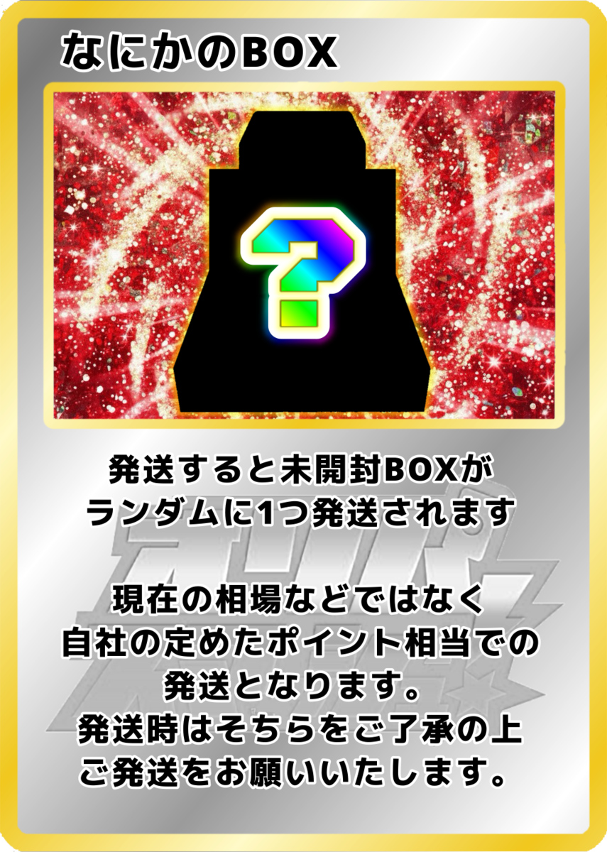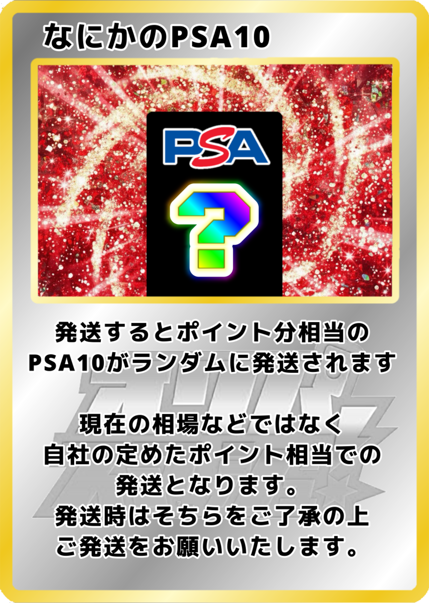 【カードやケースの状態について】 オリパから排出されるカードや鑑定済みカード(ケース入り)には、微細な傷や初期キズが見られる場合がございます。 特に鑑定済みカード(PSA等)は、鑑定機関が付与したグレードに基づいて販売しております。そのため、ケース内部で確認できる擦れや異物については、返品・交換を承ることができませんのでご了承ください。 また、ガチャから排出されるカードは一部鑑定済みカードではございませんので、個体差があります。予めご確認の上ご購入くださいませ。 【未開封商品の取り扱い】 未開封BOXやパックであっても、外装にスレや凹み、シュリンクの破れやテープ跡などがある場合がございます。また、流通過程上「再シュリンクの可能性を完全に否定すること」はできません。 安心してご利用いただくため、商品到着から開封までを通して動画撮影を推奨しております。動画内で偽造品と確認できた場合に限り、返品・交換を受け付けます。撮影の際は梱包物全体が画面に収まるようご注意ください。 【商品画像について】 掲載している画像はあくまでイメージであり、実際にお届けするカードやアイテムの状態・排出内容を保証するものではございません。表示以外のカードやアイテムが排出される可能性もあります。 【還元率とコインについて】 還元率は「対象のオリパをすべて購入した場合の理論値」に基づいています。 ただし、抽選によって得られるカードのコイン換算額は完全ランダムであり、すべての口数で同一の金額が保証されるものではございません。 【返品・交換について】 システムの性質上、原則として商品の返品・交換・返金はできません。 【演出表示について】 抽選時の演出動画はお楽しみ要素であり、当選内容やランクを保証するものではありません。通信環境や端末の仕様により、演出が正しく表示されない場合がありますが、その際も抽選結果や景品には影響ございません。再抽選・返金などの対応はいたしかねます。 【エディションに関する注意】 1st Edition(1ED)とアンリミテッド版が存在する商品については、商品タイトルにエディションの記載がない場合、どちらかを選択することはできません。 商品画像に1EDの表記があった場合でも、タイトルに記載がなければ対象外となりますので、あらかじめご了承ください。