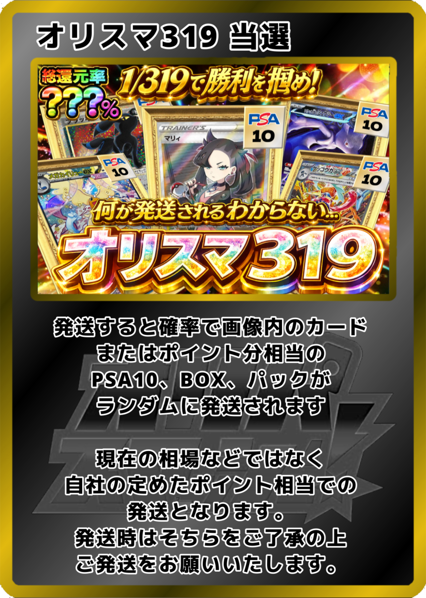 【カードやケースの状態について】 オリパから排出されるカードや鑑定済みカード(ケース入り)には、微細な傷や初期キズが見られる場合がございます。 特に鑑定済みカード(PSA等)は、鑑定機関が付与したグレードに基づいて販売しております。そのため、ケース内部で確認できる擦れや異物については、返品・交換を承ることができませんのでご了承ください。 また、ガチャから排出されるカードは一部鑑定済みカードではございませんので、個体差があります。予めご確認の上ご購入くださいませ。 【未開封商品の取り扱い】 未開封BOXやパックであっても、外装にスレや凹み、シュリンクの破れやテープ跡などがある場合がございます。また、流通過程上「再シュリンクの可能性を完全に否定すること」はできません。 安心してご利用いただくため、商品到着から開封までを通して動画撮影を推奨しております。動画内で偽造品と確認できた場合に限り、返品・交換を受け付けます。撮影の際は梱包物全体が画面に収まるようご注意ください。 【商品画像について】 掲載している画像はあくまでイメージであり、実際にお届けするカードやアイテムの状態・排出内容を保証するものではございません。表示以外のカードやアイテムが排出される可能性もあります。 【還元率とコインについて】 還元率は「対象のオリパをすべて購入した場合の理論値」に基づいています。 ただし、抽選によって得られるカードのコイン換算額は完全ランダムであり、すべての口数で同一の金額が保証されるものではございません。 【返品・交換について】 システムの性質上、原則として商品の返品・交換・返金はできません。 【演出表示について】 抽選時の演出動画はお楽しみ要素であり、当選内容やランクを保証するものではありません。通信環境や端末の仕様により、演出が正しく表示されない場合がありますが、その際も抽選結果や景品には影響ございません。再抽選・返金などの対応はいたしかねます。 【エディションに関する注意】 1st Edition(1ED)とアンリミテッド版が存在する商品については、商品タイトルにエディションの記載がない場合、どちらかを選択することはできません。 商品画像に1EDの表記があった場合でも、タイトルに記載がなければ対象外となりますので、あらかじめご了承ください。